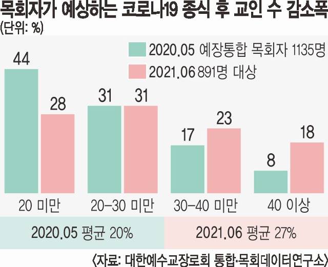 12일 목회데이터연구소에 따르면 지난 6월 대한예수교장로회 통합 소속 목회자 891명을 설문 조사한 결과, 응답자 중 18%가 코로나19 종식 후 교인 수가 40% 이상 줄어들 것으로 예상했다. 지난해 5월에는 목회자 1135명 중 오직 8%만이 성도 수 40% 이상 감소를 우려했었다. 교인 수가 20~30% 줄 것으로 본 목회자 비중이 31%로 가장 컸다. 연구소는 “교인 수 예상 감소 폭이 1년 전 평균 20%에서 현재 27%로 증가했다”며 “코로나가 길어지면서 목회자의 불안감이 더 커지고 있는 것을 반영하는 수치”라고 분석했다.