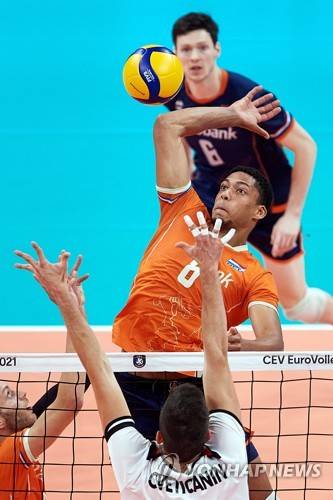 epa09464216 Fabian Plak (C) of the Netherlands in action against Portugal's Filip Cveticanin (front) during the 2021 Men's European Volleyball Championship round of 16 match between the Netherlands and Portugal in Gdansk, northern Poland, 12 September 2021. EPA/Adam Warzawa POLAND OUT