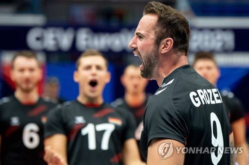 epa09464275 Gyorgy Grozer of Germany reacts during the EuroVolley 2021 Men Round of 16 match between Germany and Bulgaria in Ostrava, Czech Republic, 12 September 2021. EPA/LUKAS KABON