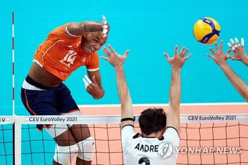 epa09464282 Nimir Abdel- Aziz (L) of the Netherlands in action against Portugal's Andre Reis Lopes (R) during the 2021 Men's European Volleyball Championship round of 16 match between the Netherlands and Portugal in Gdansk, northern Poland, 12 September 2021. EPA/Adam Warzawa POLAND OUT