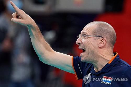 epa09464285 Netherlands' head coach Robert Piazza reacts during the 2021 Men's European Volleyball Championship round of 16 match between the Netherlands and Portugal in Gdansk, northern Poland, 12 September 2021. EPA/Adam Warzawa POLAND OUT