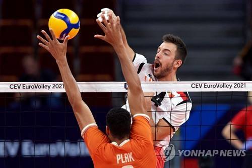 epa09464287 Fabian Plak (front) of the Netherlands in action against Portugal's Filip Cveticanin (back) during the 2021 Men's European Volleyball Championship round of 16 match between the Netherlands and Portugal in Gdansk, northern Poland, 12 September 2021. EPA/Adam Warzawa POLAND OUT
