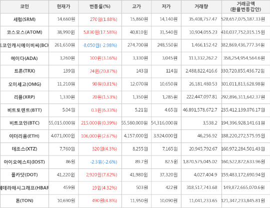 또한, 코스모스(17.58%, 38,990원), 폴카닷(7.62%, 41,220원), 비트토렌트(6.33%, 5.04원), 톤(4.8%, 10,690원), 헤데라해시그래프(4.32%, 459원), 테조스(4.3%, 7,760원), 에이다(3.16%, 3,260원), 이더리움(2.67%, 4,071,000원), 세럼(1.88%, 14,660원), 리플(1.53%, 1,330원), 오미세고(0.81%, 11,210원)가 상승세를 나타냈다.