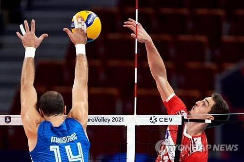 epa09464382 Serbia's Aleksandar Atanasijevic (L) in action against Turkey's Yigit Gulmezoglu (R) during the 2021 Men's European Volleyball Championship round of 16 match between Serbia and Turkey in Gdansk, northern Poland, 12 September 2021. EPA/Adam Warzawa POLAND OUT