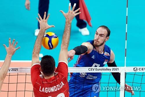 epa09464386 Serbia's Marko Ivovic (R) in action against Turkey's Adis Lagumdzija (L) during the 2021 Men's European Volleyball Championship round of 16 match between Serbia and Turkey in Gdansk, northern Poland, 12 September 2021. EPA/Adam Warzawa POLAND OUT