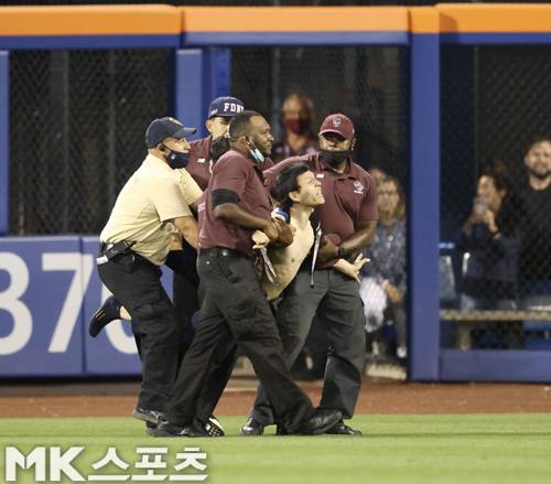 경기장에 난입한 관중이 보안요원에 의해 붙들려 끌려가고 있다.