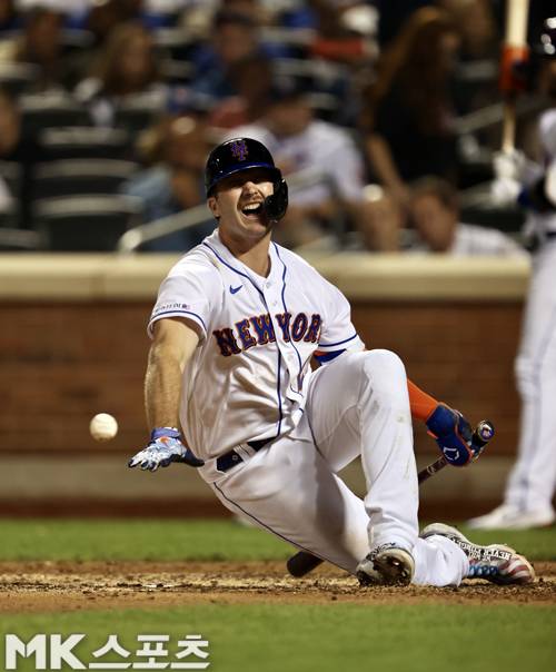 메츠의 피트 알론소가 헛스윙 이후 쓰러지며 괴로워하고 있다.