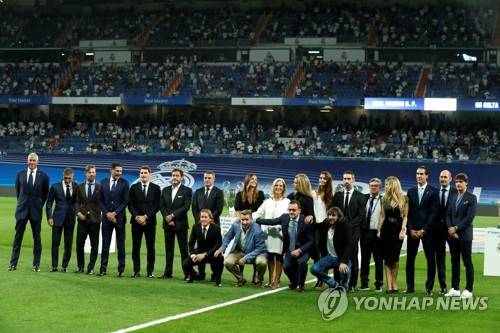 epa09464514 Former Real Madrid's players and relatives of former Real Madrid's president Lorenzo Sanz, who passed on 21 March 2020 with the coronavirus disease, ahead of the Spanish La Liga soccer match between Real Madrid and Celta Vigo at the reopened Santiago Bernabeu stadium in Madrid, central Spain, 12 September 2021. EPA/Emilio Naranjo