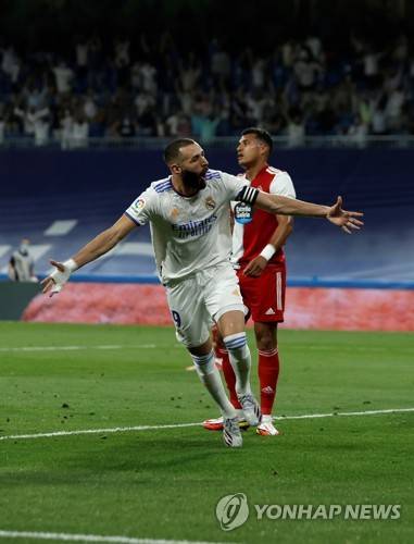epa09464516 Real Madrid's striker Karim Benzema (C) celebrates after scoring a goal during the Spanish La Liga soccer match between Real Madrid and Celta Vigo at the reopened Santiago Bernabeu stadium in Madrid, central Spain, 12 September 2021. EPA/Emilio Naranjo