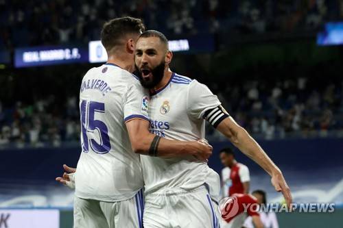 epa09464558 Real Madrid's striker Karim Benzema (R) celebrates with teammate Federico Valverde (L) after scoring a goal during the Spanish La Liga soccer match between Real Madrid and Celta Vigo at the reopened Santiago Bernabeu stadium in Madrid, central Spain, 12 September 2021. EPA/Emilio Naranjo