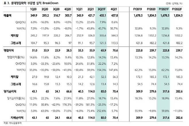 하나금융투자는 3분기 롯데정밀화학이 영업이익 659억원을 시현하며 사상 최대치를 재차 경신할 것으로 전망했다.
