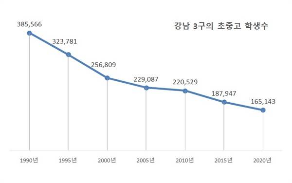 | ▲ 강남 3구의 학생수 각 년도 교육통계에서 추출, 강남 3구의 초중고 학생수는 꾸준히 감소했다. 학생 감소하니 교부금 줄이자는 논리에서 강남 3구도 피해갈 수 없을지 모른다. |