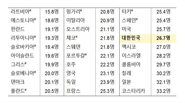 | ▲ 중학교 학급당 학생수 OECD 교육지표 2020에서 추출했다(www.oecd.org). 2018년 데이터이며, 다른 8개국은 수치 없다. 우리나라는 OECD 내에서 중하위권이고, 우리보다 1인당 국민총소득 적은 국가(# 표시)에 비해 뒤쳐지는 경우도 있다. |