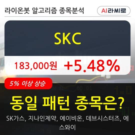 이 시각 거래소에서 SKC 이외에도 SK가스(9.51%), 지나인제약(19.19%), 에이비온(10.0%), 데브시스터즈(29.94%), 에스와이(8.63%) 등이 상승세를 보이고 있다.