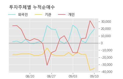 ◆ 주체별 매매동향- 개인의 거래비중 크게 높음, 거래비중 96.0% (최근한달)지난 한달을 기준으로 보면 외국인이 1.7만주를 순매수한 반면, 기관은 1.9만주를 순매도했고, 개인들도 3,132주를 순매도한 것으로 집계됐다.