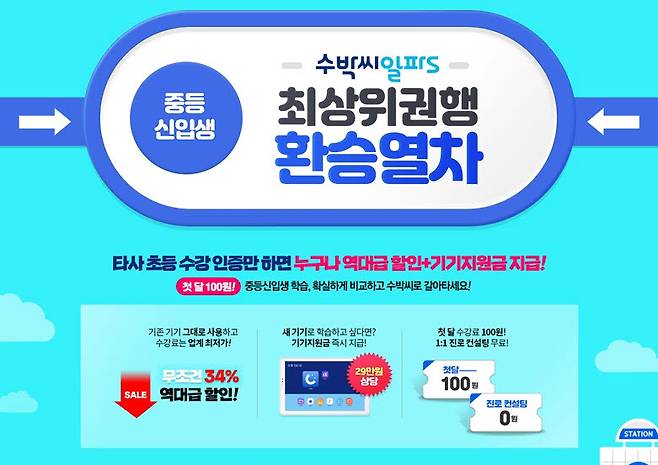 이세미 수박씨닷컴 마케팅 담당자는 “초·중등 과정을 완벽하게 연계한 학습 콘텐츠와 다양한 평가 시스템을 통해 체계적인 중등 학습은 물론, 취약한 부분을 점검할 수 있도록 했다”라며 “많은 예비 중학생들이 수박씨알파S 강좌를 경험해볼 수 있도록 환승 할인 이벤트를 진행하고 있는데 많은 관심을 부탁드린다”라고 말했다.