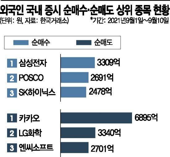 반면 외국인은 정부의 규제 이슈가 불거진 카카오에 대해 6895억원어치 주식을 매도했다. 중국 정부의 플랫폼 규제로 텐센트, 알리바바 등의 주가가 조정을 받았던 만큼 국내에서도 비슷한 흐름이 나타날 것이란 전망이 영향을 미쳤다. 실제 카카오 주가는 지난 7일 금융당국의 금융플랫폼 규제 시사 이후 3거래일 간 15.58% 빠졌다. 증권가에서는 당장 실적에 미치는 영향은 제한적일 것이라면서도 장기적으로 관련 규제 강화가 확대될 경우 주가에 부정적일 수 있다고 예상했다.