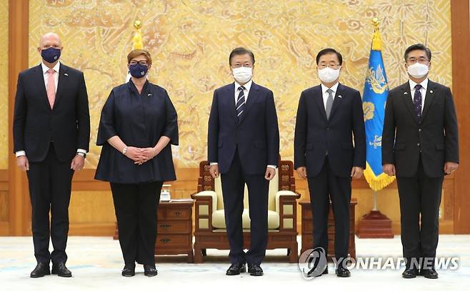 (서울=연합뉴스) 최재구 기자 = 문재인 대통령(가운데)이 13일 오전 청와대 본관 접견실에서 한국과 호주 외교·국방(2+2) 장관회의 참석차 방한한 호주의 마리스 페인 외교장관(왼쪽 두번째)과 피터 더튼 국방장관(왼쪽)을 접견하고 정의용 외교부 장관(오른쪽 두번째), 서욱 국방부 장관과 함께 기념사진을 촬영하고 있다. 2021.9.13
