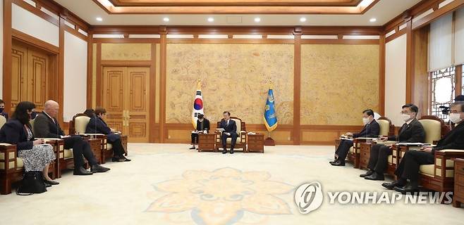(서울=연합뉴스) 최재구 기자 = 문재인 대통령이 13일 오전 청와대 본관 접견실에서 한국과 호주 외교·국방(2+2) 장관회의 참석차 방한한 호주의 마리스 페인 외교장관과 피터 더튼 국방장관을 접견하고 있다. 2021.9.13