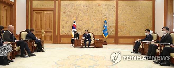 (서울=연합뉴스) 최재구 기자 = 문재인 대통령이 13일 오전 청와대 본관 접견실에서 한국과 호주 외교·국방(2+2) 장관회의 참석차 방한한 호주의 마리스 페인 외교장관과 피터 더튼 국방장관을 접견하고 있다. 2021.9.13
