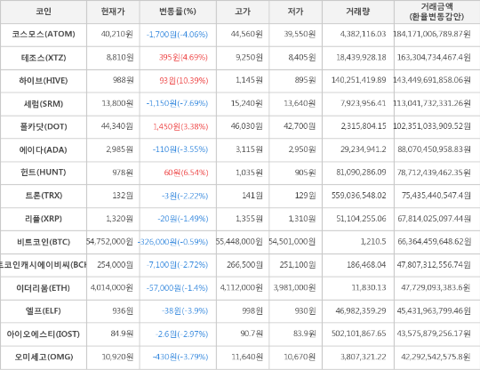 또한, 코스모스(-4.06%, 40,210원), 엘프(-3.9%, 936원), 오미세고(-3.79%, 10,920원), 에이다(-3.55%, 2,985원), 아이오에스티(-2.97%, 84.9원), 비트코인캐시에이비씨(-2.72%, 254,000원), 트론(-2.22%, 132원), 리플(-1.49%, 1,320원), 이더리움(-1.4%, 4,014,000원)이 하락세를 나타냈다.