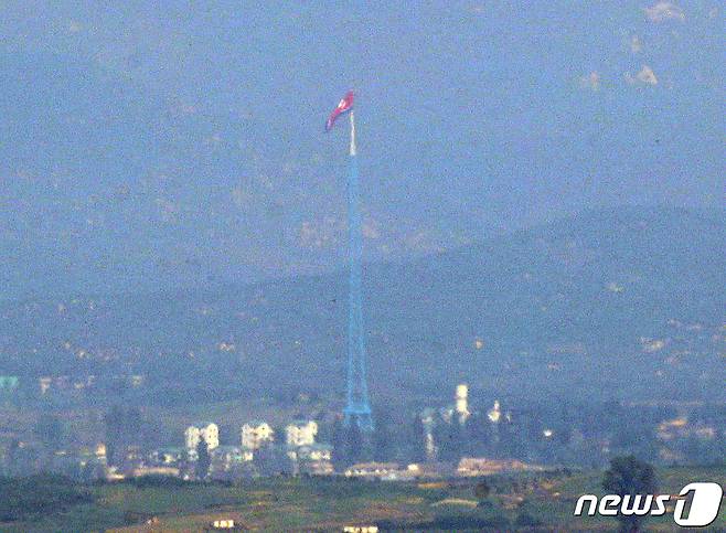 (파주=뉴스1) 신웅수 기자 = 13일 경기 파주시에서 바라본 북한 황해북도기정동 마을에 인공기가 휘날리고 있다.