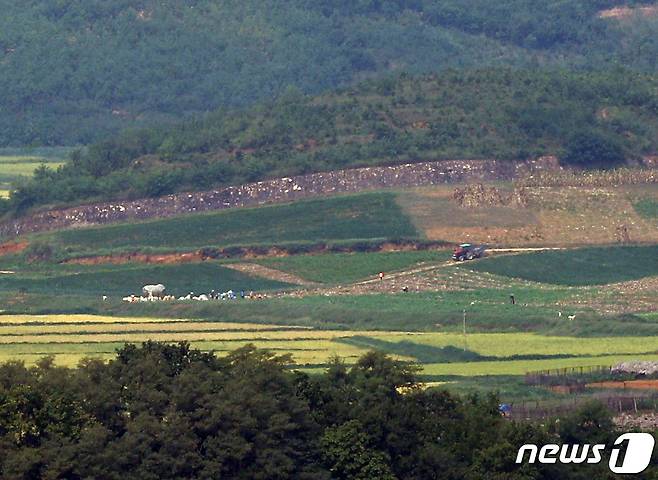 (파주=뉴스1) 신웅수 기자 = 13일 경기 파주시에서 바라본 북한 황해북도 개풍군 마을에서 주민들이 밭일을 하고 있다.