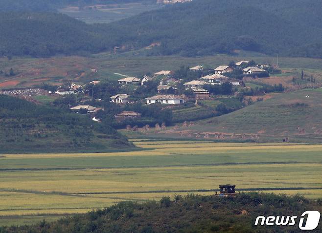 (파주=뉴스1) 신웅수 기자 = 13일 경기 파주시에서 바라본 북한 황해북도 개풍군 마을이 적막한 모습을 보이고 있다.