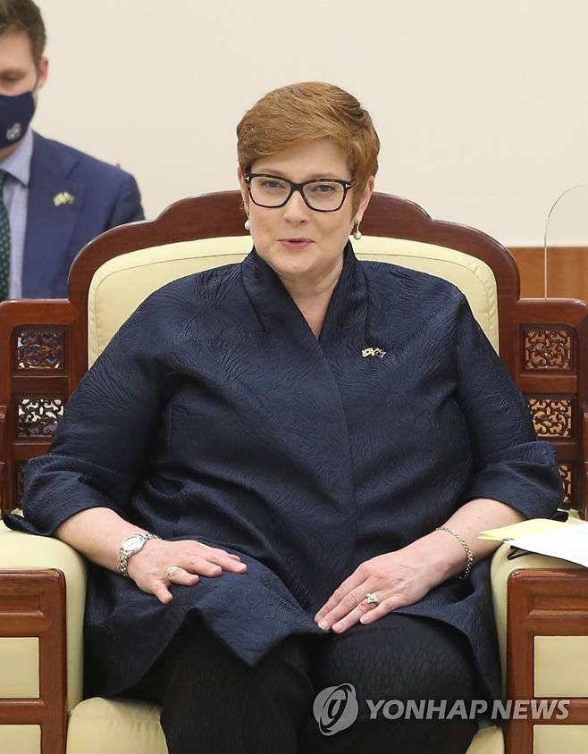 (서울=연합뉴스) 최재구 기자 = 한국과 호주 외교·국방(2+2) 장관회의 참석차 방한한 호주의 마리스 페인 외교장관이 13일 오전 청와대 본관 접견실에서 문재인 대통령을 예방, 인사말을 하고 있다. 2021.9.13