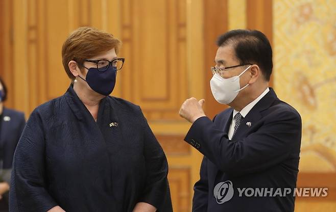 (서울=연합뉴스) 최재구 기자 = 정의용 외교부 장관이 13일 오전 문재인 대통령 예방을 위해 청와대를 방문한 호주 마리스 페인 외교장관과 대화하고 있다. 2021.9.13