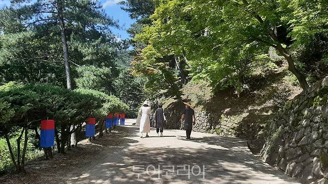 청명한 가을 날(13일) 도산서원( 경북 안동시 도산면)을 찾은 관광객이 문화관광해사설와 퇴계 이황선생의 업적에 대한 얘기를 도란도란 나누며 도산서원길을 걷고 있다.