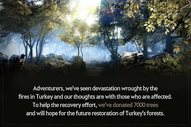 펄어비스는 ‘검은사막’, ‘검은사막 모바일’ 글로벌 이용자와 함께 대규모 산불 피해를 입은 터키에 묘목 7000그루를 기부했다고 13일 밝혔다.