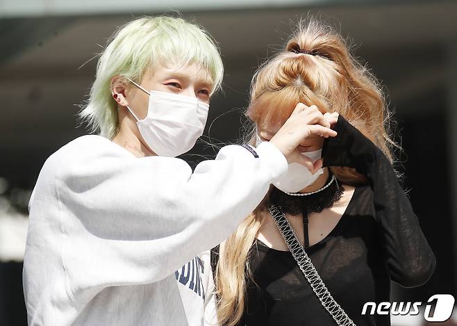 (서울=뉴스1) 권현진 기자 = 가수 현아, 던 커플이 13일 서울 목동 SBS에서 진행되는 SBS라디오 파워FM '최화정의 파워타임'을 위해 방송국으로 들어서며 하트로 인사를 전하고 있다. 2021.9.13/뉴스1