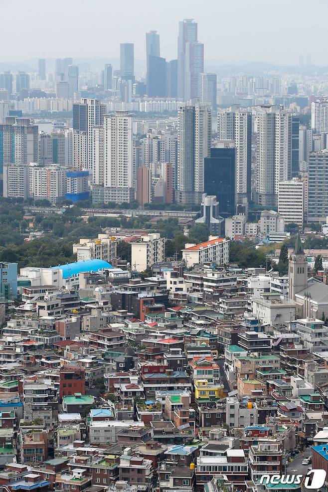 (서울=뉴스1) 안은나 기자 = 13일 서울 중구 남산에서 바라본 도심. 이날 한국부동산원의 주간 아파트 가격동향조사에 따르면, 9월 첫째주(6일 기준) 수도권 아파트값은 전주에 비해 0.40% 올랐다. 이로써 4주 연속으로 역대 최고 상승률이 유지됐다. 서울은 0.21%로 6주 연속 0.2%대의 높은 상승률을 기록했다. 2021.9.13/뉴스1