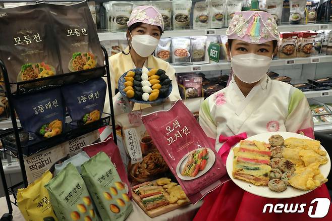 (서울=뉴스1) = 13일 오전 이마트 성수점에서 모델들이 피코크 간편 제수음식을 소개하고 있다.