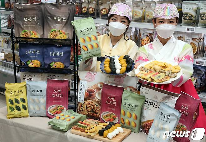 (서울=뉴스1) = 13일 오전 이마트 성수점에서 모델들이 피코크 간편 제수음식을 소개하고 있다.