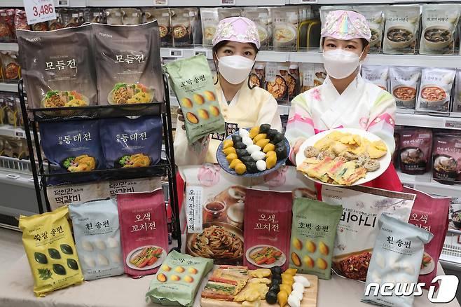 (서울=뉴스1) = 13일 오전 이마트 성수점에서 모델들이 피코크 간편 제수음식을 소개하고 있다.