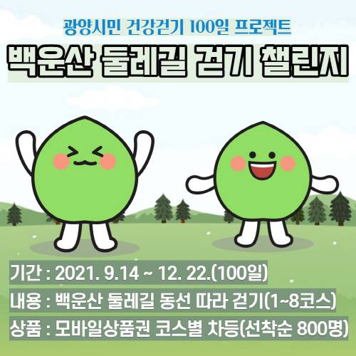 GPS 신호를 기반으로 광양의 명산 백운산 둘레길 1∼8코스 중 걷기좋은길 일부를 지정해 9월 14일부터 12월 22일까지 100일 동안 진행되며, 정해진 구간 80% 이상 걷고 쿠폰 '받기'를 누르면 선물함에 쿠폰이 자동 발급되는 걷기 이벤트이다.