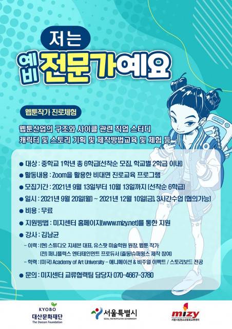 저는 예비전문가예요는 코로나19에 따른 진로 교육 공백을 메우기 위한 진로 교육 프로그램으로, 청소년들의 재능·적성을 고려한 다양한 진로 체험 활동 제공이 목적이다. 올해는 청소년들의 장래 희망으로 주목받는 직업인 웹툰 작가 관련 직업 체험으로 기획됐다.