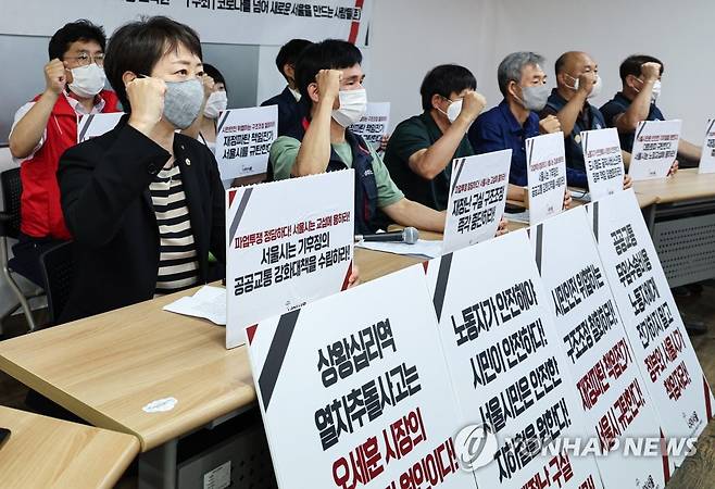 (서울=연합뉴스) 황광모 기자 = 서울교통공사 노동조합이 구조조정 반대를 위한 파업을 예고한 가운데 13일 오후 서울 중구 민주노총에서 열린 서울교통공사 구조조정 중단 촉구·파업 지지 사회시민단체 기자회견에서 코로나 너머 새로운 서울을 만드는 사람들(너머서울) 관계자들이 서울시의 노정 교섭 참여를 요구하는 구호를 외치고 있다.
