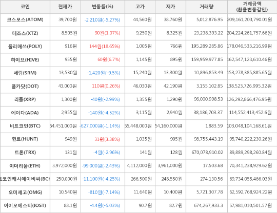 또한, 오미세고(-7.14%, 10,540원), 코스모스(-5.27%, 39,700원), 아이오에스티(-5.03%, 83.1원), 에이다(-4.52%, 2,955원), 비트코인캐시에이비씨(-4.25%, 250,000원), 리플(-2.99%, 1,300원), 트론(-2.96%, 131원), 이더리움(-2.43%, 3,972,000원)이 하락세를 나타냈다.