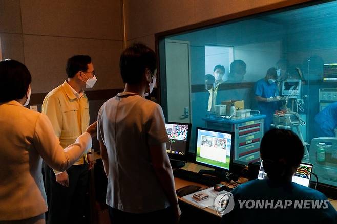 (서울=연합뉴스) 정종철 교육부 차관(왼쪽 두 번째)이 13일 전북 익산 원광보건대학교를 방문해 실습수업 현장을 참관하고 있다. 2021.9.13