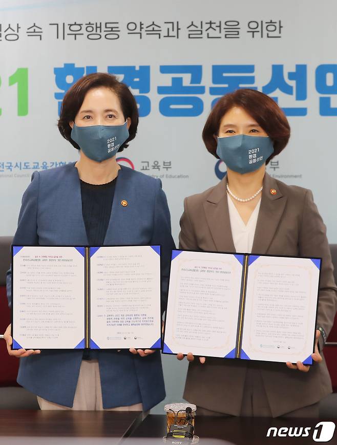 (서울=뉴스1) 민경석 기자 = 유은혜 사회부총리 겸 교육부 장관(왼쪽)과 한정애 환경부 장관이 13일 오후 서울 영등포구 여의도 한국교육시설안전원에서 열린 '환경공동선언 및 탄소중립 실천방안 영상회의'에 참석해 선언문을 들고 기념촬영을 하고 있다.