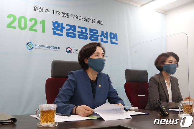 (서울=뉴스1) 민경석 기자 = 유은혜 사회부총리 겸 교육부 장관(왼쪽)이 13일 오후 서울 영등포구 여의도 한국교육시설안전원에서 열린 '환경공동선언 및 탄소중립 실천방안 영상회의'에 참석해 인사말을 하고 있다. 오른쪽은 한정애 환경부 장관.
