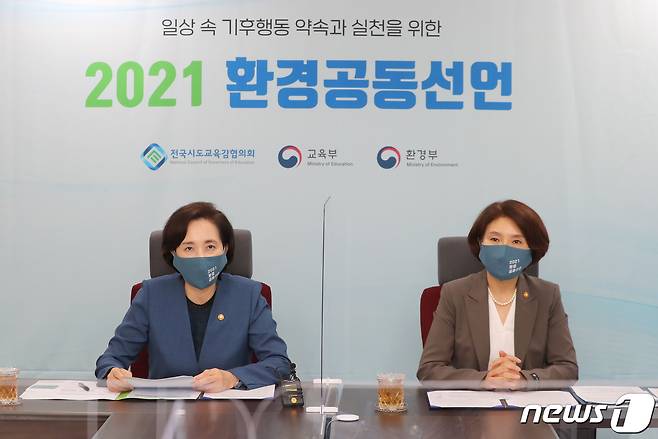 (서울=뉴스1) 민경석 기자 = 유은혜 사회부총리 겸 교육부 장관(왼쪽)이 13일 오후 서울 영등포구 여의도 한국교육시설안전원에서 열린 '환경공동선언 및 탄소중립 실천방안 영상회의'에 참석해 인사말을 하고 있다. 오른쪽은 한정애 환경부 장관.