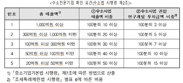 수소전문기업 지정 제도는 수소법에 따라 총 매출액 중 수소사업 연관 매출액 비중이나 수소사업 관련 연구개발 투자금액 비중이 요건을 만족할 경우 확인증을 발급하는 제도다.