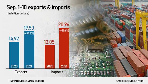 The country’s exports came at $19.5 billion in September 1-10, up 30.7 percent from the same period a year earlier, according to the preliminary data released by the Korea Customs Service on Wednesday. Daily exports also jumped 30.7 percent based on the same 8.5 working days last year.