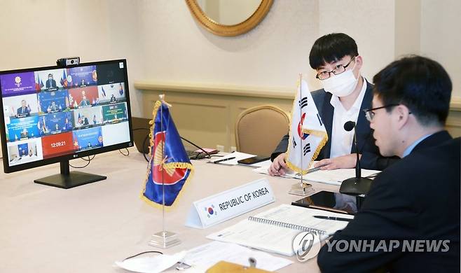 (서울=연합뉴스) 여한구 산업통상자원부 통상교섭본부장이 12일(현지시간) 워싱턴DC에서 화상으로 열린 '한-아세안 경제장관회의'에 참석해 인사말을 하고 있다. 2021.9.13