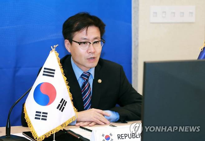 (서울=연합뉴스) 여한구 산업통상자원부 통상교섭본부장이 12일(현지시간) 워싱턴DC에서 화상으로 열린 '한-아세안 경제장관회의'에 참석해 인사말을 하고 있다. 2021.9.13