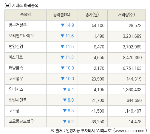 [fnRASSI]장마감, 거래소 하락 종목(동부건설우 -14.9% ↓)